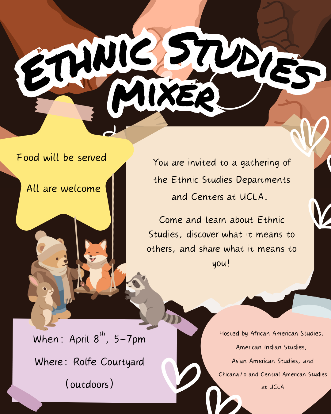 The Ethnic Studies Departments at UCLA are excited to announce that they are bringing back our Ethnic Studies Mixer! Join us as we get to talk about the Ethnic departments’ history and current works. Meet people across the departments over provided dinner!